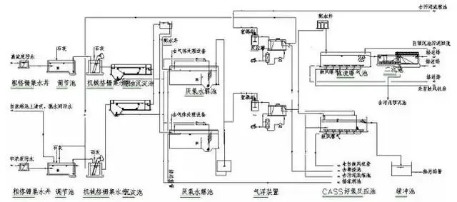 食品加工废水以生物处理为核心,结合物理、化学预处理技术。物理处理法有筛滤、沉淀、气浮等,多用于预处理;化学处理法包括中和、混凝、膜分离等;生物处理法分为好氧工艺(如活性污泥法、氧化沟、SBR等)、厌氧工艺及组合工艺。厌氧处理适用于高浓度废水,动力消耗低,产生的沼气可作为能源,剩余污泥量少;好氧处理则适用于低浓度废水。典型的CASS工艺流程为:污水经调节池均质后进入CASS反应池,通过曝气、沉淀、排水等阶段降解有机物,投加石灰乳调节pH值,剩余污泥进入消化池处理后外运处置,出水达标排放。