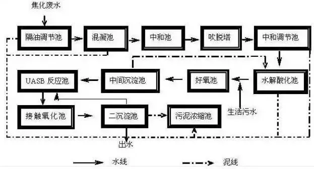 焦化废水的处理需结合物理、化学和生化技术。物理处理法有吸附法、混凝沉淀法、Fenton试剂法;生化处理法常用A/O与A²/O法、SBR法、氧化沟技术;化学处理法则包括催化湿式氧化、臭氧氧化、光催化氧化等。典型工艺流程为:焦化废水先经隔油调节池去除浮油、均质水质,再进入混凝池、中和池预处理,通过吹脱塔去除氨氮后,依次经UASB反应池、水解酸化池、接触氧化池进行生物降解,最后经沉淀池分离污泥,污泥浓缩后处置,出水达标排放。
