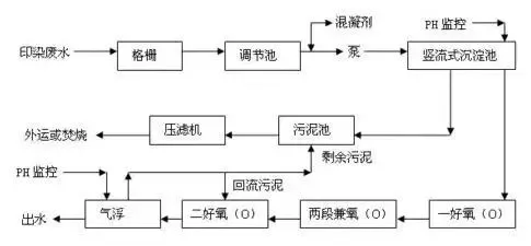 印染废水处理常用物理法、化学法与生物法的组合工艺。物理法包括格栅、沉淀、气浮、膜技术等;化学法有中和、混凝、电解、氧化等;生物法分为厌氧、好氧、兼氧生物处理。典型工艺流程为:印染废水经格栅去除大颗粒杂质后进入调节池均质,投加混凝剂后在竖流式沉淀池沉淀,再依次经两段兼氧池、好氧池进行生物降解,气浮处理后分离污泥,出水达标排放或回用;污泥经压滤机脱水后外运或焚烧。此外,采用UF-RO膜深度处理工艺,可实现废水的高效回用。