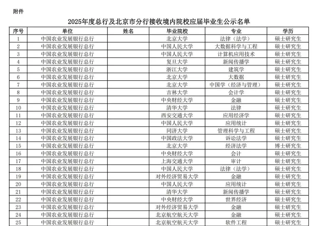 中国农业发展银行总行2021年总共录取接近80人,2022年共招录49人,但2025年在全国范围内仅招收25位高校应届毕业生,招录人数越来越少。
