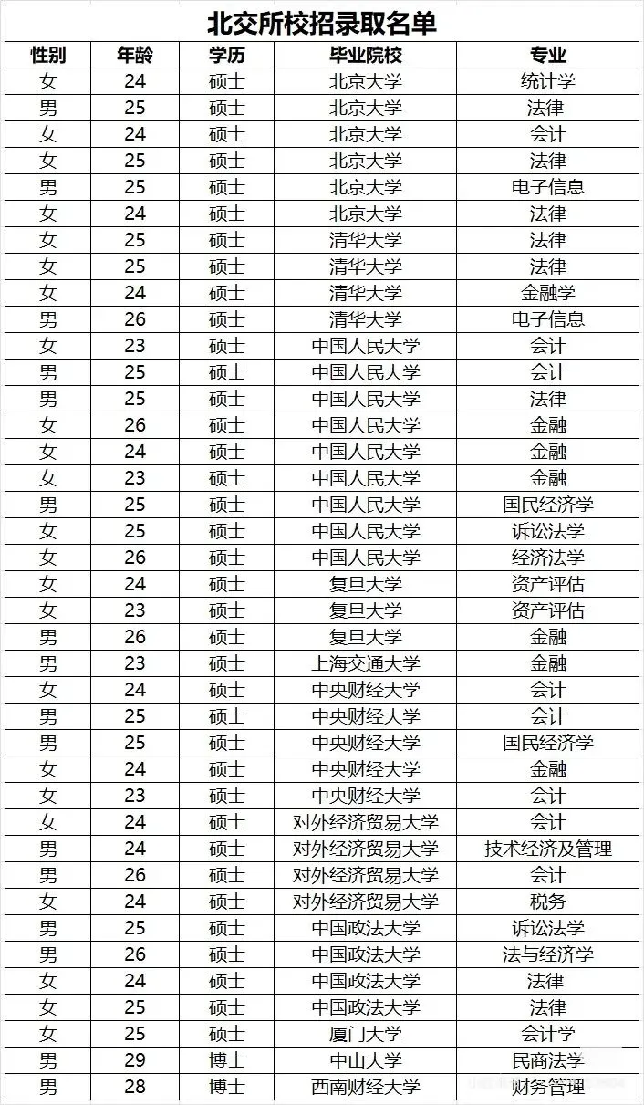 在看就业情况之前,我希望没有在北京学习、工作过的朋友们,可以在网上多了解了解北京这边的就业数据,以及北京院校VS外地院校,在北京就业的差距,感受两点:1、北京这个城市的威力。把北京当作一个普通城市看,这是一个很大的误解;2、北京高校,在北京就业的威力。经管专业的硕士,南大、浙大来了,都没有中财、外经贸好使。人大5人(大数据科学与工程1人,计算机应用技术1人,应用统计2人,法律1人)北大4人(法律、大数据、经济与管理、经济法学各1人)复旦(新闻传播学)、上交(审计)、浙大(建筑学)、同济(管理科学与工程)、西安交大(应用经济学)、吉林大学(会计)、中国政法(诉讼法学)各1人