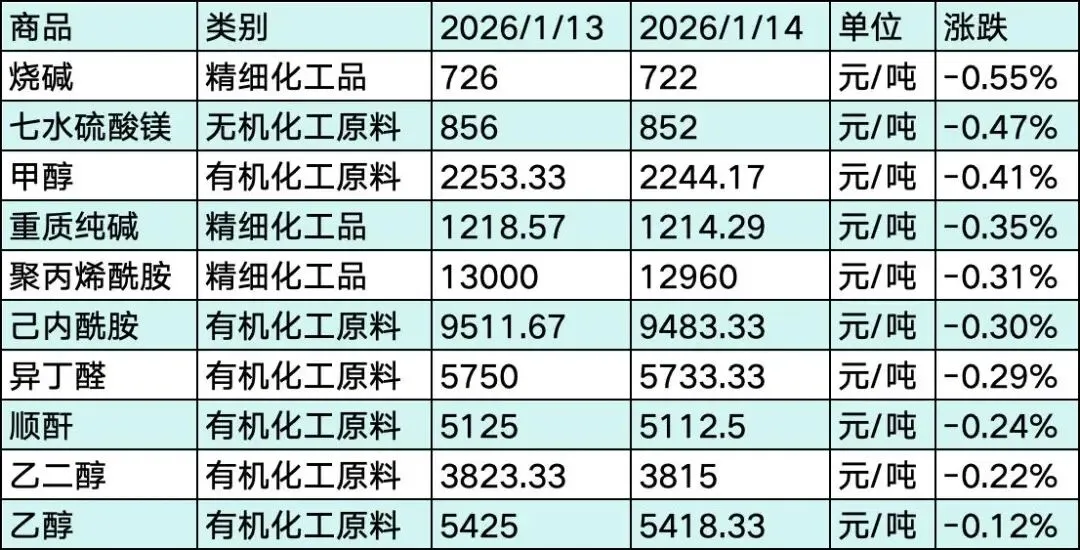 -下跌品种数量少,跌幅极致收窄:仅10种产品价格下跌,下跌品种数量较此前显著减少。所有下跌品种跌幅均不足1%,呈现“全员窄调”特征:烧碱以-0.55%的跌幅成为跌幅最大品种,七水硫酸镁(-0.47%)、甲醇(-0.41%)形成0.4%-0.5%跌幅区间;重质纯碱(-0.35%)、聚丙烯酰胺(-0.31%)等其余5种下跌品种跌幅均在-0.30%至-0.12%之间。下跌压力主要集中于传统基础化工领域,核心源于淡季节奏下的需求疲软与供需边际宽松,无趋势性下跌风险。