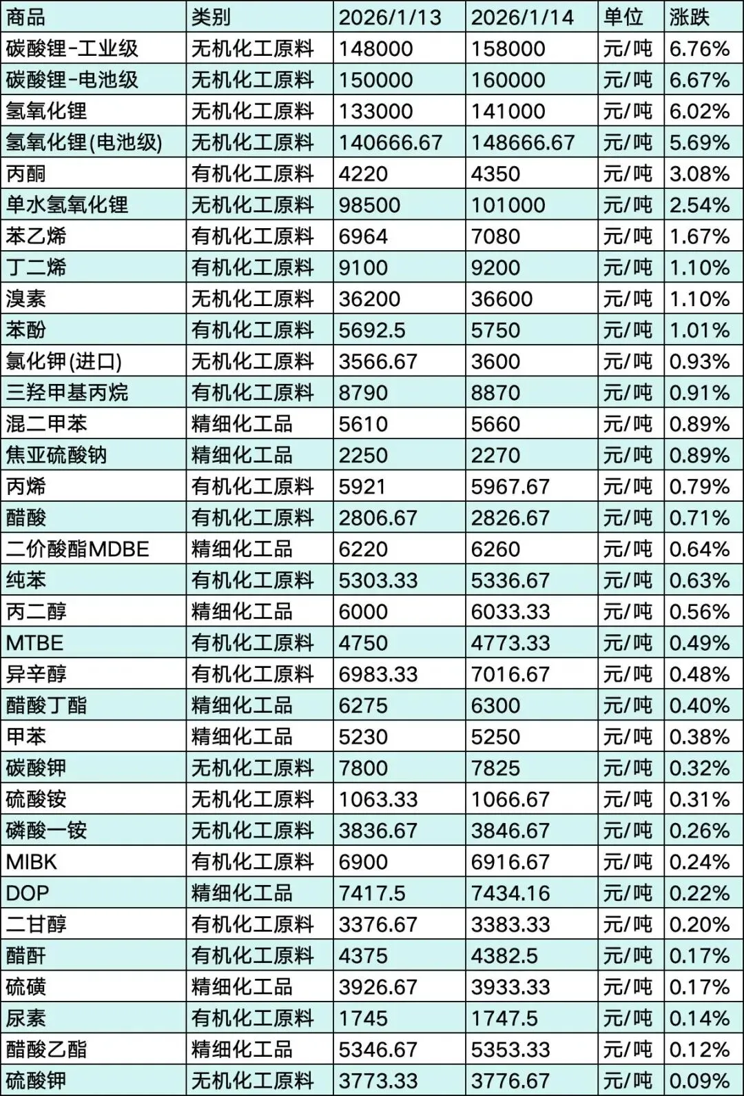 -上涨品种占绝对优势,梯度分布清晰:监测的化工原料中,34种实现价格上涨,上涨品种数量占比显著提升。上涨品种形成“核心高弹性、中游稳增长、尾部弱反弹”的完整梯度:碳酸锂-工业级以6.76%的涨幅登顶,碳酸锂-电池级(6.67%)、氢氧化锂(6.02%)、电池级氢氧化锂(5.69%)紧随其后,构成5%-7%的高涨幅梯队;丙酮(3.08%)、单水氢氧化锂(2.54%)形成2%-3%的中涨幅梯队;苯乙烯(1.67%)、溴素(1.10%)等10种品种涨幅在1%-2%区间;其余18种上涨品种涨幅均集中在0.09%-0.93%的温和区间。上涨动力源于“锂电备货冲刺+海南零关税政策红利+原油成本传导+节前补货需求”的多元共振。