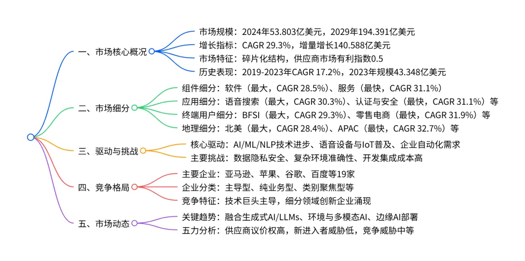2024-2029 年全球 AI 语音识别市场将保持高速增长,2024 年市场规模为 53.803 亿美元,2029 年预计达 194.391 亿美元,CAGR 达 29.3%,增量增长 140.588 亿美元;市场呈碎片化结构,供应商市场有利指数稳定在 0.5,软件是最大组件细分市场(2024 年占比 71.3%),语音搜索是最大应用细分市场(2024 年占比 42.9%),BFSI是最大终端用户细分市场(2024 年占比 31.3%),北美是最大地理细分市场(2024 年占比 38.4%)且贡献 36.6% 增量增长,APAC是增长最快区域(CAGR 32.7%);核心驱动因素包括 AI 与 NLP 技术进步、语音智能设备普及等,主要挑战为数据隐私安全问题、复杂环境下的准确性不足等,市场竞争涉及亚马逊、苹果、谷歌等 19 家主要企业。