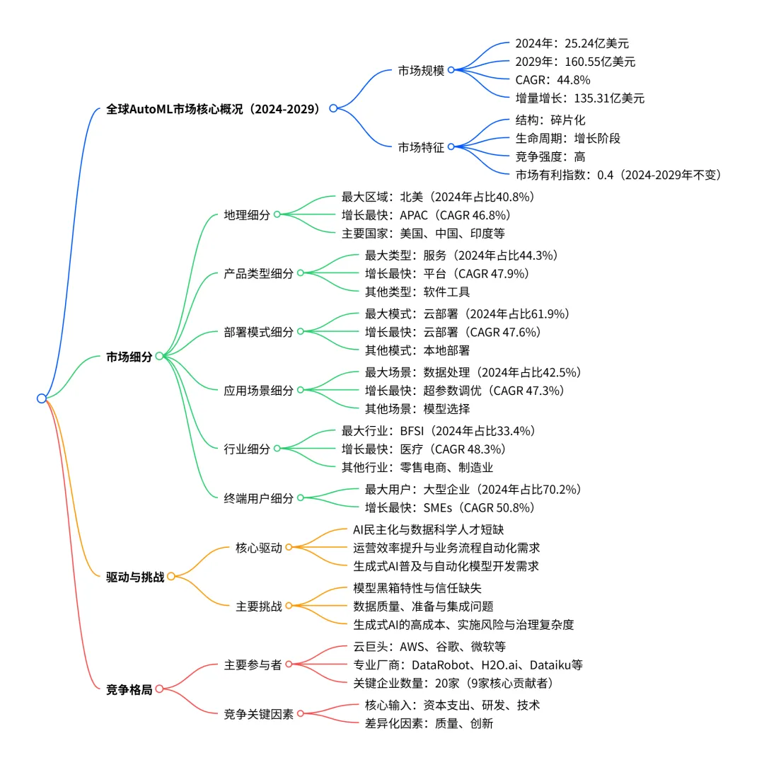 2024-2029 年全球 AutoML 市场呈高速增长态势,2024 年市场规模达25.24 亿美元,预计 2029 年将增至160.55 亿美元,CAGR 高达 44.8%,增量增长达135.31 亿美元;市场结构呈碎片化,竞争激烈,北美为最大市场(2024 年占比 40.8%),APAC为增长最快区域(CAGR 46.8%);云部署(占比 61.9%)、服务类产品(占比 44.3%)、BFSI 行业(占比 33.4%)和大型企业(占比 70.2%)为 2024 年各细分领域的最大 segment,而平台类产品(CAGR 47.9%)、医疗行业(CAGR 48.3%)和SMEs(CAGR 50.8%)为增长最快细分;市场驱动因素包括 AI 民主化、运营效率需求和生成式 AI 普及,核心挑战为模型黑箱问题、数据质量问题及生成式 AI 成本与治理复杂度,竞争格局由云巨头(如 AWS、谷歌)和专业 AI 厂商(如 DataRobot、H2O.ai)主导。