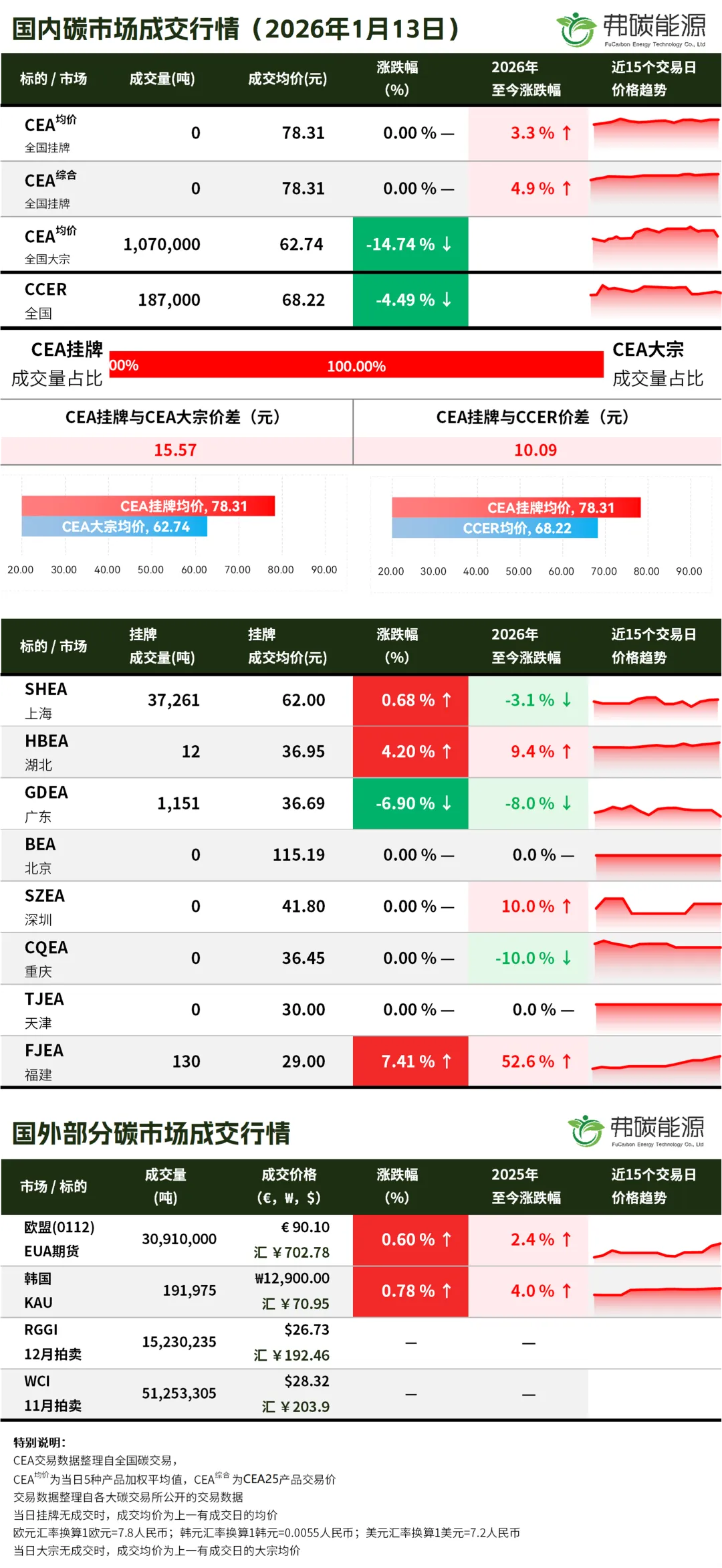 >碳市行情26.1.13 | CEA挂牌无成交,大宗成交量107万吨...