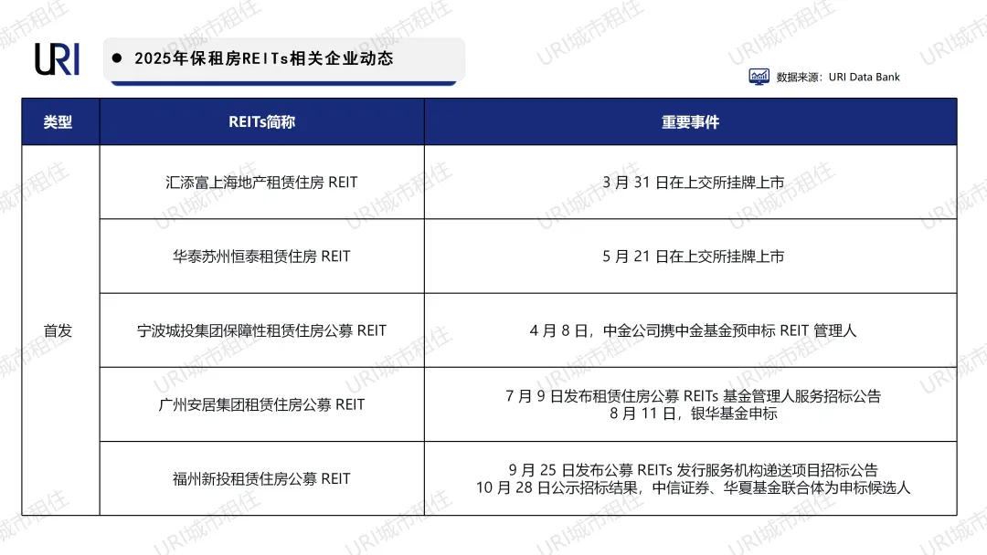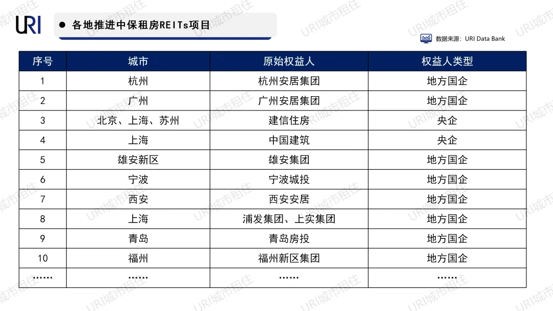 URI梳理发现,目前市场仍有20余单项目实质推进中:项目落地城市正在从北上深和苏州、厦门等沿海重点城市向更多核心城市扩张,包括广州、杭州、南京、青岛以及内陆核心城市西安和昆明;参与主体也快速扩容,涵盖杭州安居、宁波城投等地方国企,以及建信住房、中国建筑等央企。