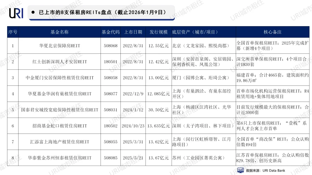 URI研究显示:截至2025年12月,我国共有77支基础设施REITs首发上市,首发规模约1993亿元,其中8支为保租房REIT,首发规模合计约121亿元,发行规模占比约6.1%。2025年密集上市5支保租房REITs,市场实现了从“首单破冰”到“批量供给”的跨越。