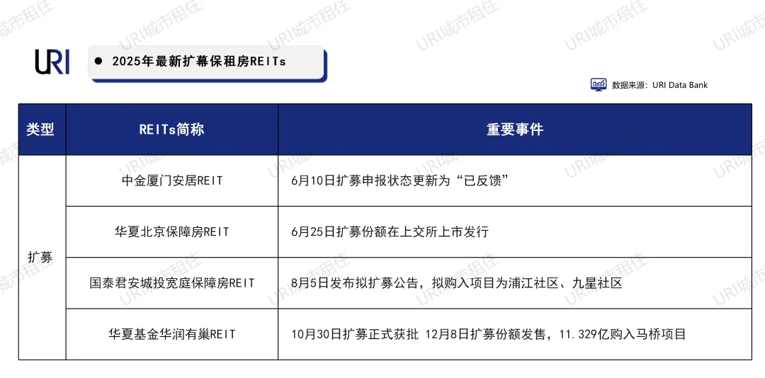 URI观察发现,2025年发改委“782号文”进一步加快扩募节奏。租赁住房REIT以其运营稳定的显著优势得到投资人的青睐,交投活跃。与此同时,扩募进程也在加速推进,其中中金厦门安居REIT、华夏北京保障房REIT、国泰君安城投宽庭保障房REIT、华夏基金华润有巢REIT陆续扩募获批准。