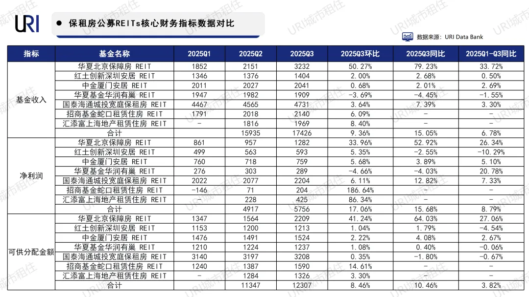 截止目前最新披露数据,三季度保租房REITs运营业绩稳健向好。URI按可比口径计算:2025年三季度保租房REITs整体收入、净利润、可供分配金额同环比均有所增长,刨除华夏北京保障房REIT扩募带来的影响,业绩整体亦呈平稳态势。