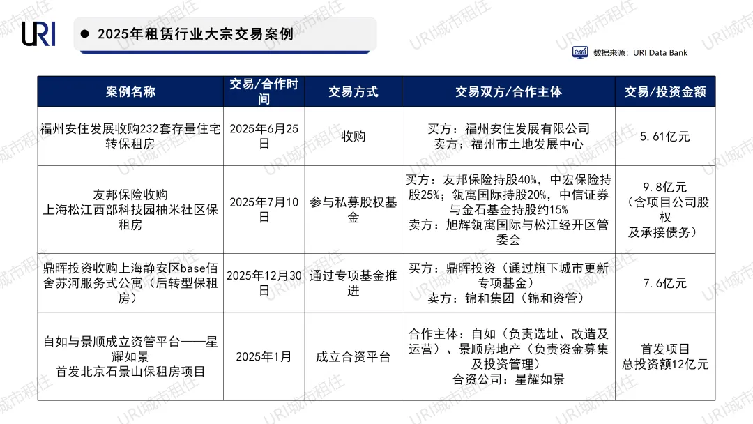 2025年租赁领域发生的大宗收并购交易,集中呈现“主体多元、标的聚焦、模式闭环”的特征,折射出租赁住房市场正从“资产盘活”向“资本化运营”的深层转型。