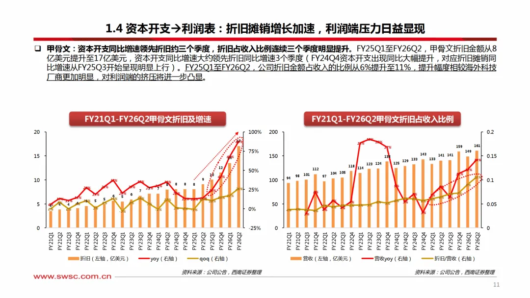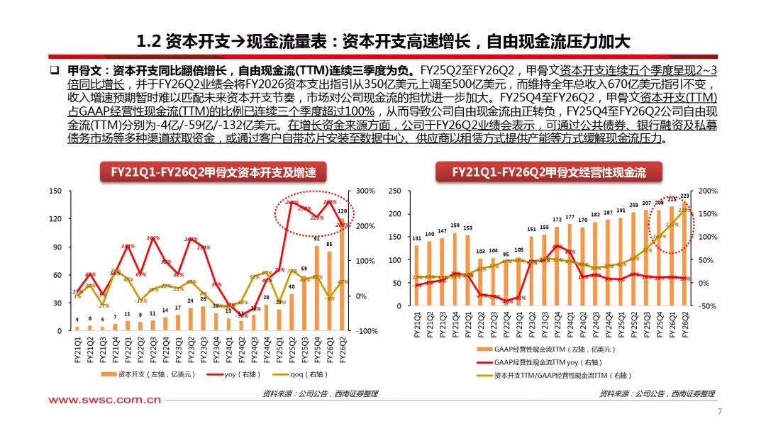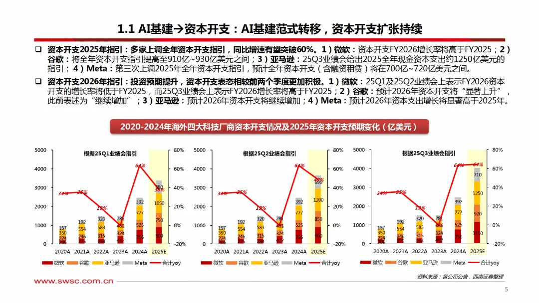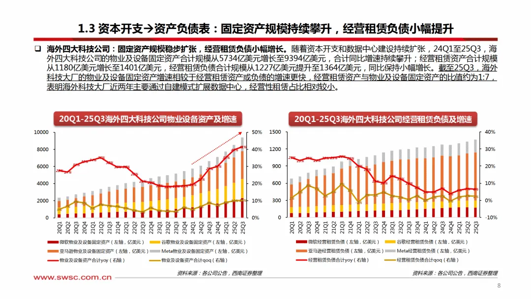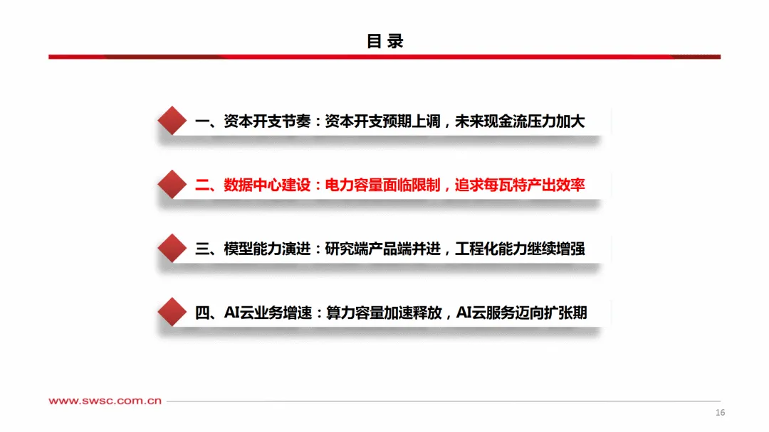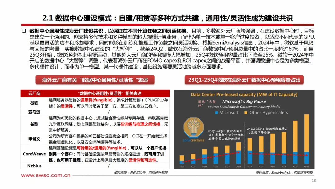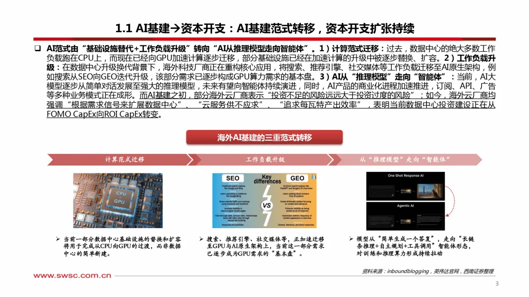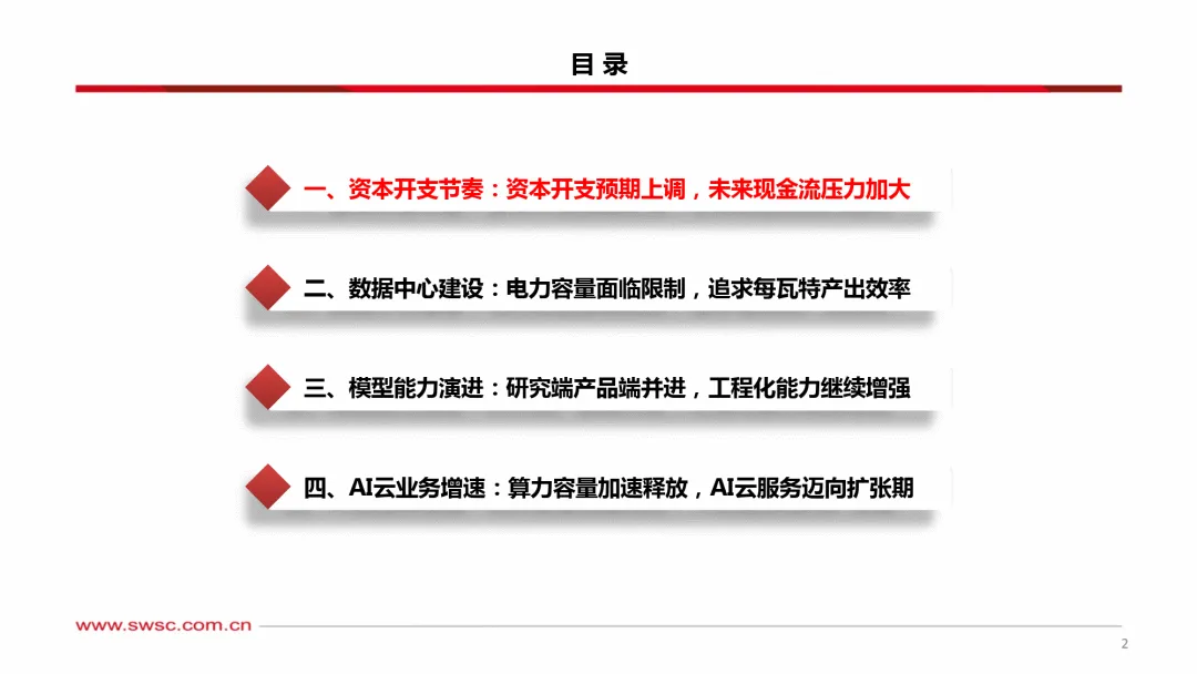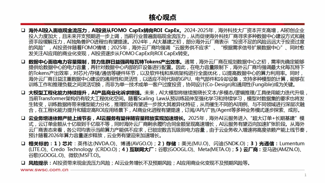 核心结论:海外 AI 行业正从 FOMO 情绪驱动的盲目投资(FOMO CapEx)转向注重投资回报率的理性布局(ROI CapEx),资本开支持续扩张但现金流压力凸显,数据中心建设聚焦电力效率与通用性,模型迭代强化工程化能力,AI 云服务迈入规模化扩张期。