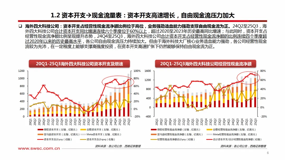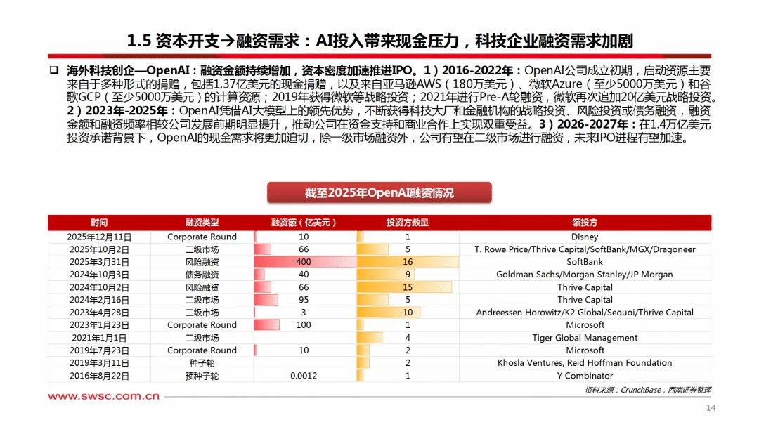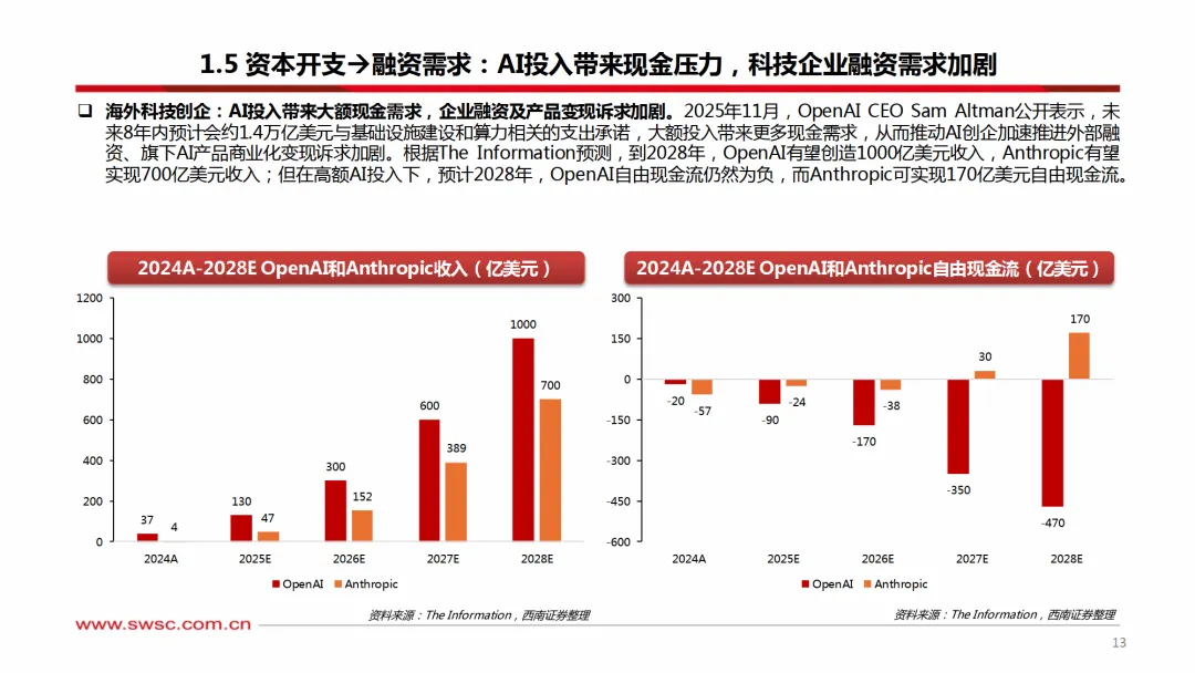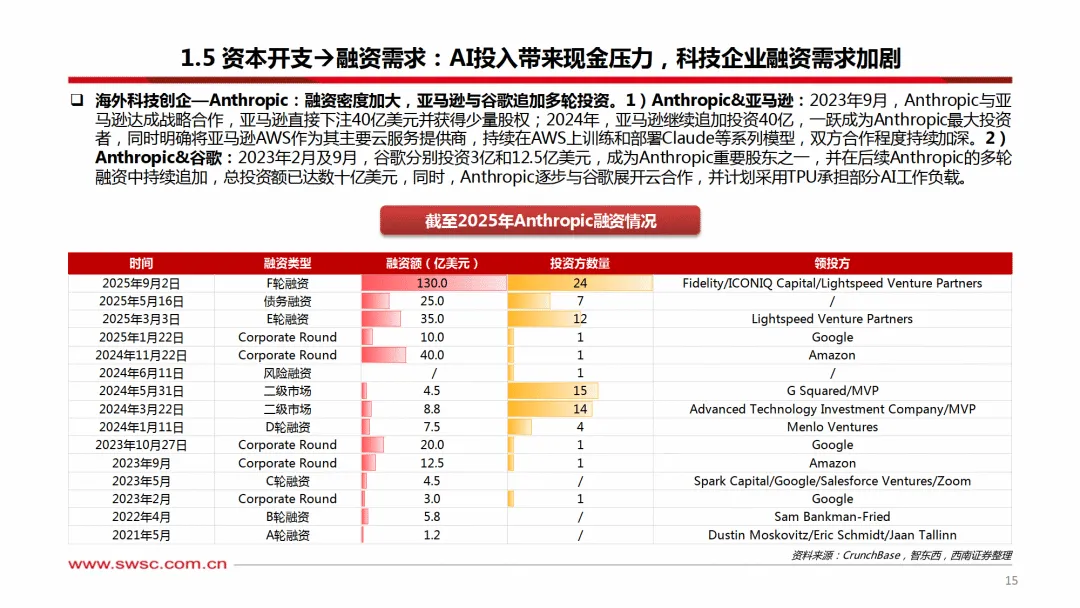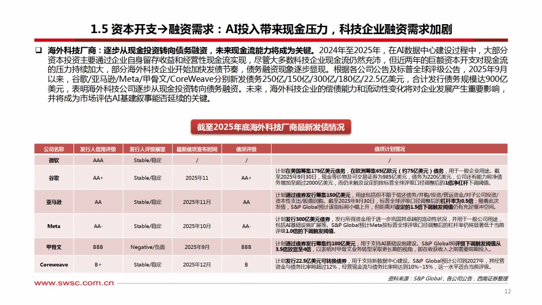 2024-2025 年,海外科技大厂资本开支大幅增长,微软、谷歌、亚马逊等均上调 2025-2026 年开支指引,合计同比增速有望突破 60%。高强度投资导致现金流压力加大,甲骨文自由现金流连续三季度为负,谷歌、亚马逊等通过债务融资缓解压力,2025 年 9 月以来合计发债达 900 亿美元。AI 初创企业融资需求迫切,OpenAI、Anthropic 加速融资进程,IPO 预期升温。