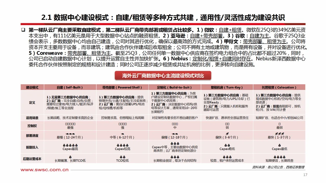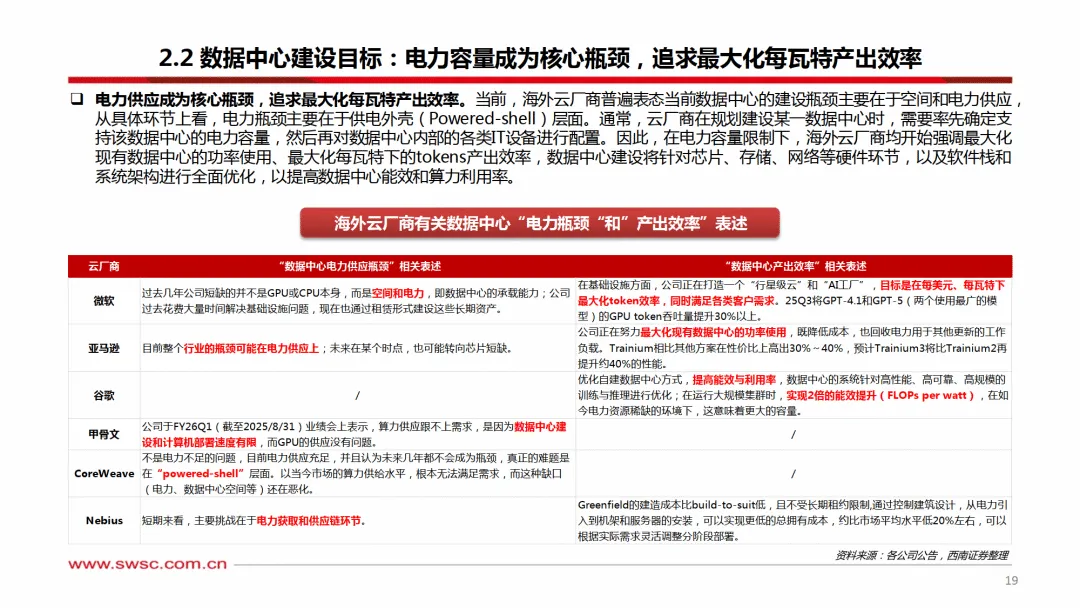 电力容量成为数据中心建设核心瓶颈,海外云厂商普遍追求每瓦特 Tokens 产出效率,通过软硬件协同优化提升算力利用率。建设模式呈现多元化,头部厂商以自建为主,第二梯队侧重带壳部署与租赁,通用性和灵活性成为共识,支持多代 GPU 和不同计算任务切换。芯片迭代推动能效提升,英伟达 Blackwell 系列较前代实现 50 倍 Tokens 产出增长,Rubin 系列有望再提升 10 倍。