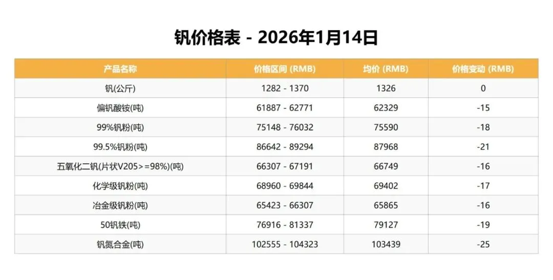 今日钒产品价格普遍小幅下跌,绝大多数产品价格延续微幅下调。钛产品市场表现分化,上游原料及部分化工产品价格微跌,但海绵钛价格则出现显著上涨。整体来看,钒市场维持弱势调整,钛市场则呈现结构性行情,部分品种逆市走强。钒荣网旨在汇聚钒钛产业链上下游企业,钒荣网将通过资讯浏览推送、“双碳”产业、在线交易推广、技术成果转让、产业金融、钒产业指数、行业标准会议会展、咨询服务数据报告等功能板块,为钒储能上下游企业提供商机对接、行业资讯、产业金融、市场拓展、名企研学、品牌宣传、数据服务、专属顾问等服务。