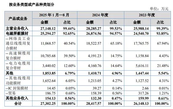公司主要产品包括具有导热散热、电磁屏蔽、绝缘耐高温等多种复合功能的电子级胶带、泡棉、导热界面材料等,应用在电子设备中,根据场景需求在各电子组件间狭小空间中实现粘接、电磁屏蔽、导热散热、绝缘等作用,其电磁屏蔽功能能够实现电子设备和元器件的电磁兼容,导热散热性能则通过传导、辐射或相变等方式将设备产生的热量及时散出,绝缘性能则具有绝缘耐压、阻燃、耐候等特性,保障电子设备稳定运行。