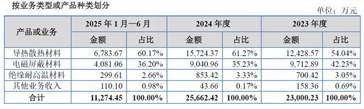 公司产品同时具有多种功能,按照其应用时的主要功能划分,可分为导热散热材料、电磁屏蔽材料和绝缘耐高温材料。