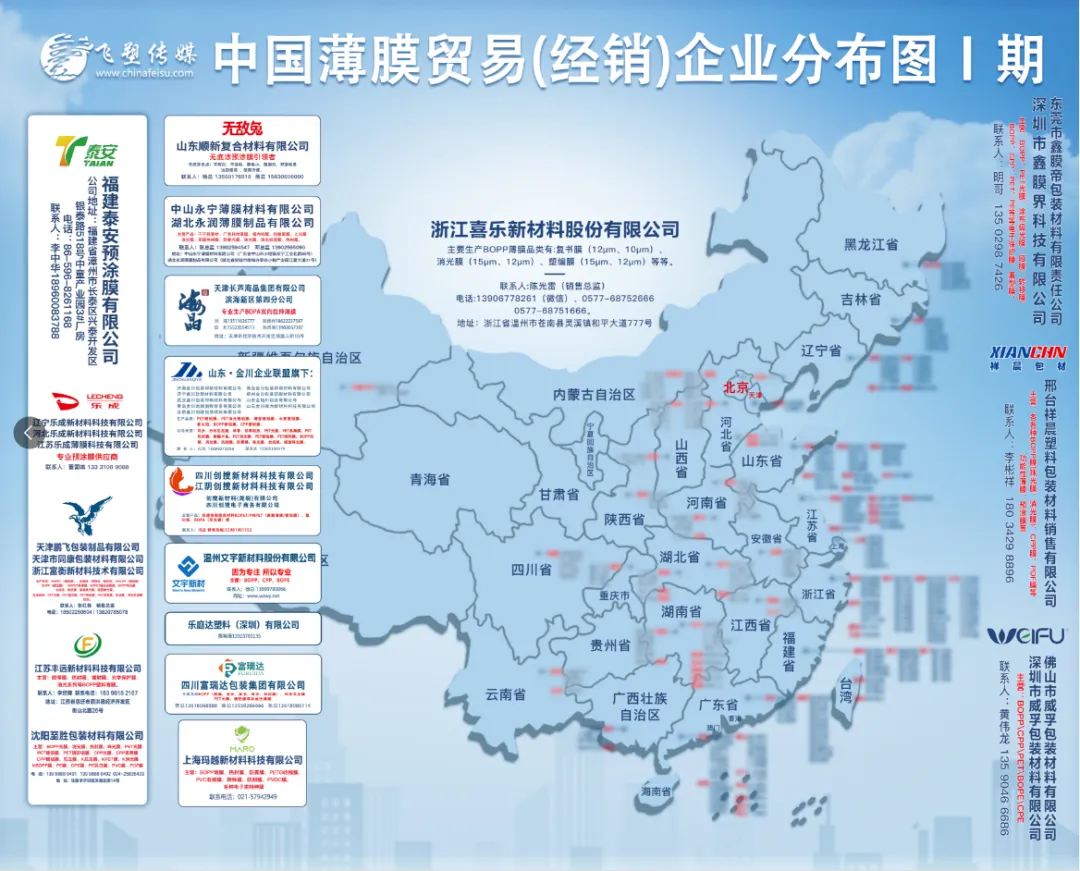 中国薄膜(贸易)企业分布图广告位所剩余位不多,虚位以待,静候卿来。在国内、国外会议、展会全年不限量派发中。中国胶带/预涂/锂电池/电容膜/镀铝膜/BOPP/BOPET/BOPA/BOPI/BOPE行业分布图及《塑友会之薄膜与包装行业大全》2025-2026年度招商工作进行时。
