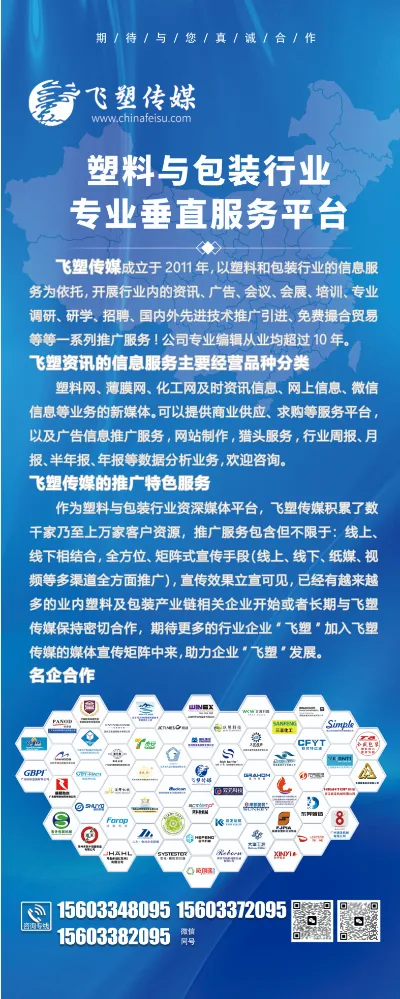 飞塑传媒成立于2011年,以塑料和包装行业的信息服务为依托,开展行业内的资讯、广告、会议、会展、培训、专业调研、研学、招聘、国内外先进技术推广引进、免费撮合贸易等等一系列推广服务!公司专业编辑从业均超过10年。 飞塑资讯的信息服务目前的主要经营品种分类有: 塑料网、薄膜网、化工网及时资讯信息、网上信息、微信信息等业务的新媒体。 可以提供商业供应、求购等服务平台,以及广告信息推广服务,网站制作,猎头服务,行业周报、月报、半年报、年报等数据分析业务,欢迎咨询。 飞塑传媒的推广特色服务:作为塑料与包装行业资深媒体平台,飞塑传媒积累了数千家乃至上万家客户资源,推广服务包含但不限于:线上、线下相结合,全方位、矩阵式宣传手段(线上、线下、纸媒、视频等多渠道全方面推广),宣传效果立宣可见,已经有越来越多的业内塑料及包装产业链相关企业开始或者长期与飞塑传媒保持密切合作,期待更多的行业企业“飞塑”加入飞塑传媒的媒体宣传矩阵中来,助力企业“飞塑”发展。