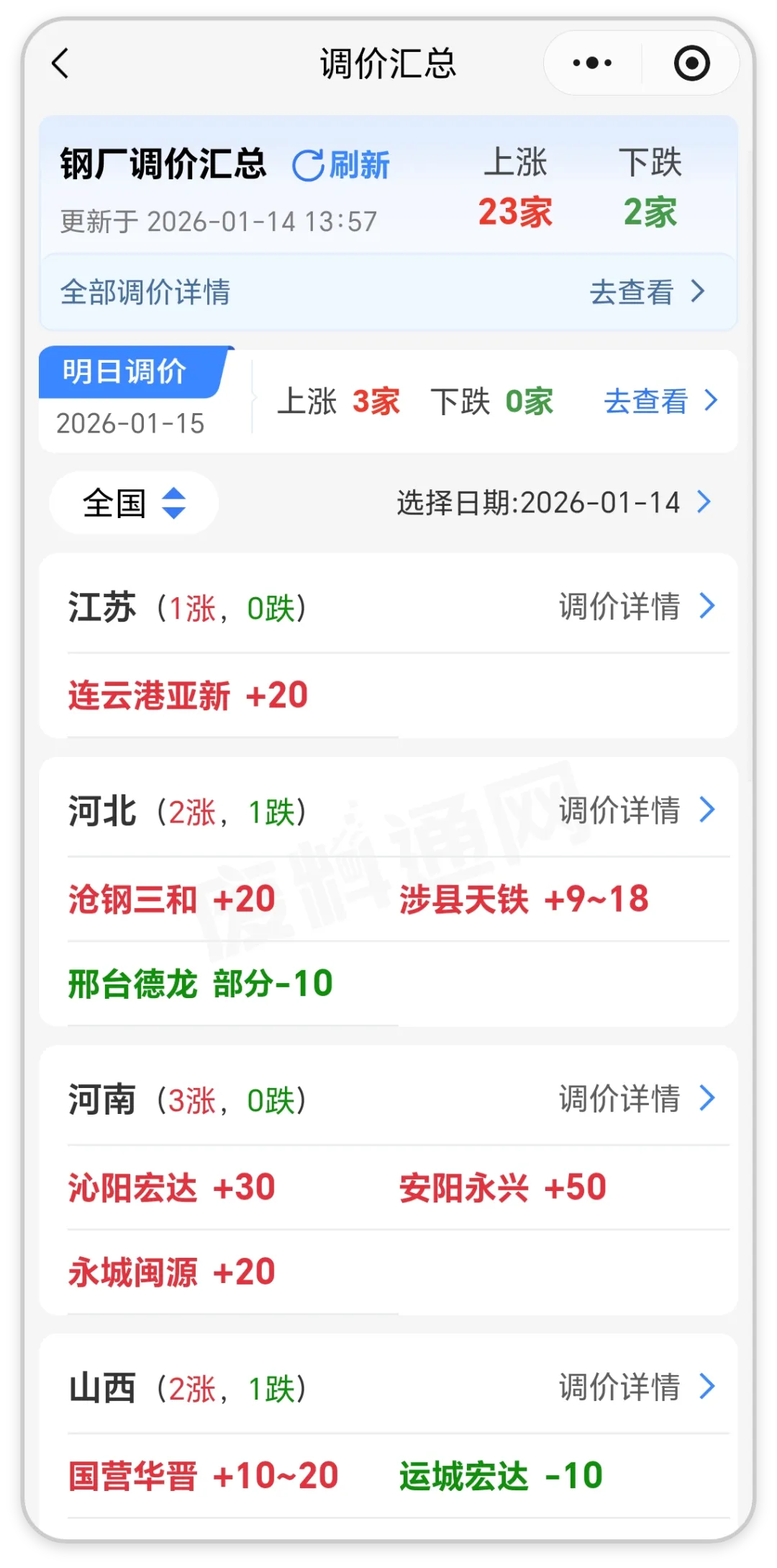 1月14日福建【顺昌宏丰】通知:废钢刨花破碎料等所有品种统一上调10元/吨,现在起执行。最新执行价:生铁 2280-2310,大件生铁 2170,优重 2300,重废 2260-2280,中废 2160-2220,小废 1890-2040,大钢刨 2180,数控/压块 2080,普刨 2020,破碎料 1940-2240,不含税