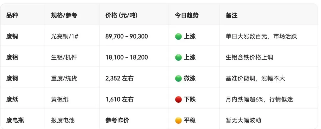 今天的市场行情非常有意思:废铜价格出现了明显的“补涨”行情(涨了),而废钢和废纸则表现平平,废铝价格相对坚挺。