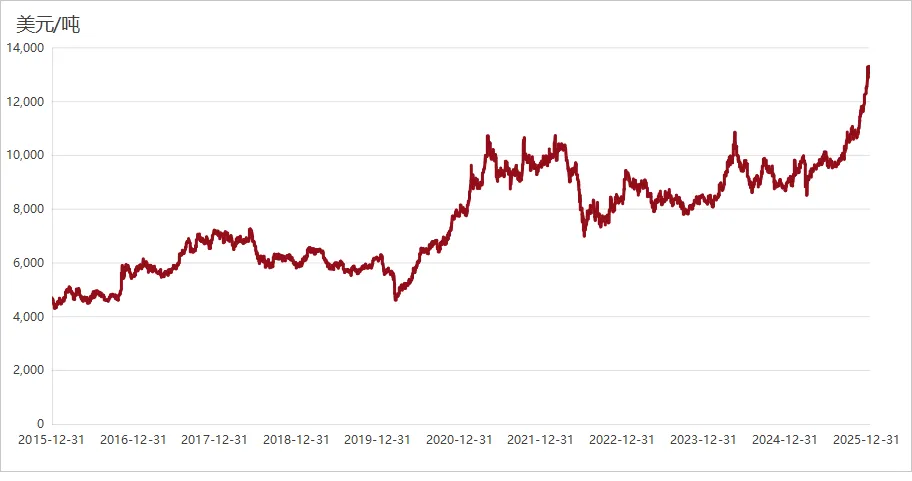 图1 2016年-2025年LME现货结算铜价走势 特别是近一年(2025 年 1 月 - 2026 年 1 月)以来,铜价走出了近十年最凌厉的上涨行情,国际与国内铜价同步攀升,且 2026 开年就创下历史新高,期间虽有短期波动,但整体上涨趋势明确。国际市场上,伦敦金属交易所(LME)期铜全年涨幅达 42.52%,2026 年开年涨势更猛,1 月 5 日强势站上 1.3 万美元大关,1 月 6 日盘中最高触及 13377.5 美元 / 吨,突破 1.33 万美元关口,刷新历史最高纪录。