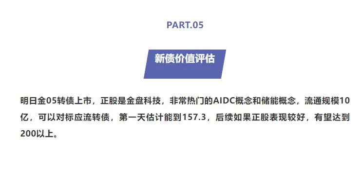 今日,“金05转债”价格封于157.3元。尽管当前价格不低,但其规模仍属偏大,我们参考近期次新债的平均溢价水平,给予约60%的估值溢价,对应目标区间预计在173-180元附近,后续走势仍需关注正股表现。
