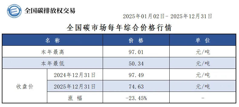 本年全国碳市场综合价格行情为:最高价97.01元/吨,最低价50.34元/吨,收盘价较去年最后一个交易日下跌23.45%。