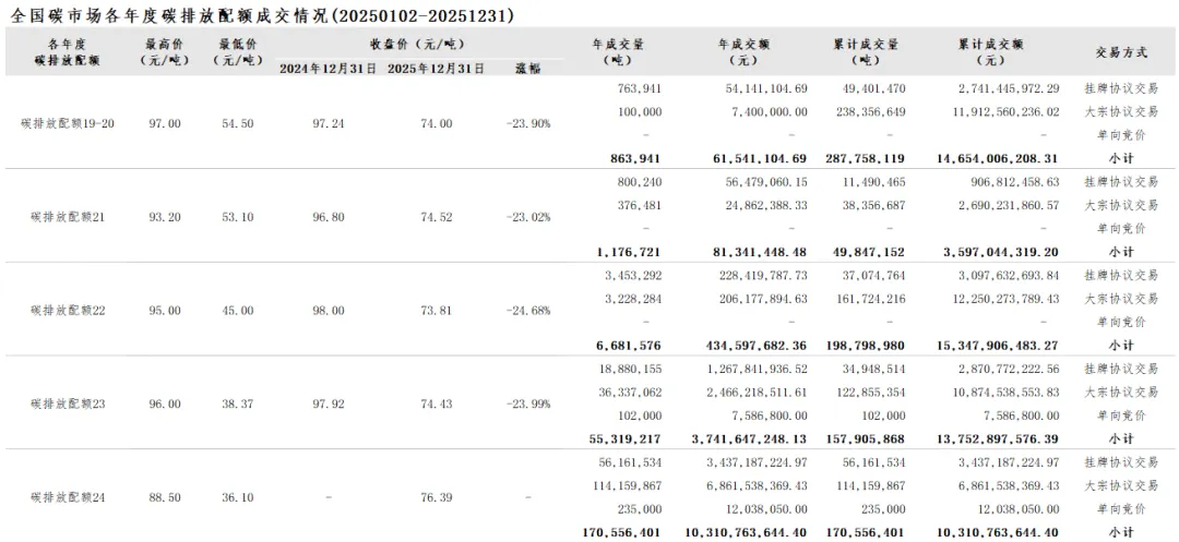 截至2025年12月31日,全国碳市场碳排放配额累计成交量864,866,520吨,累计成交额57,662,618,231.57元。