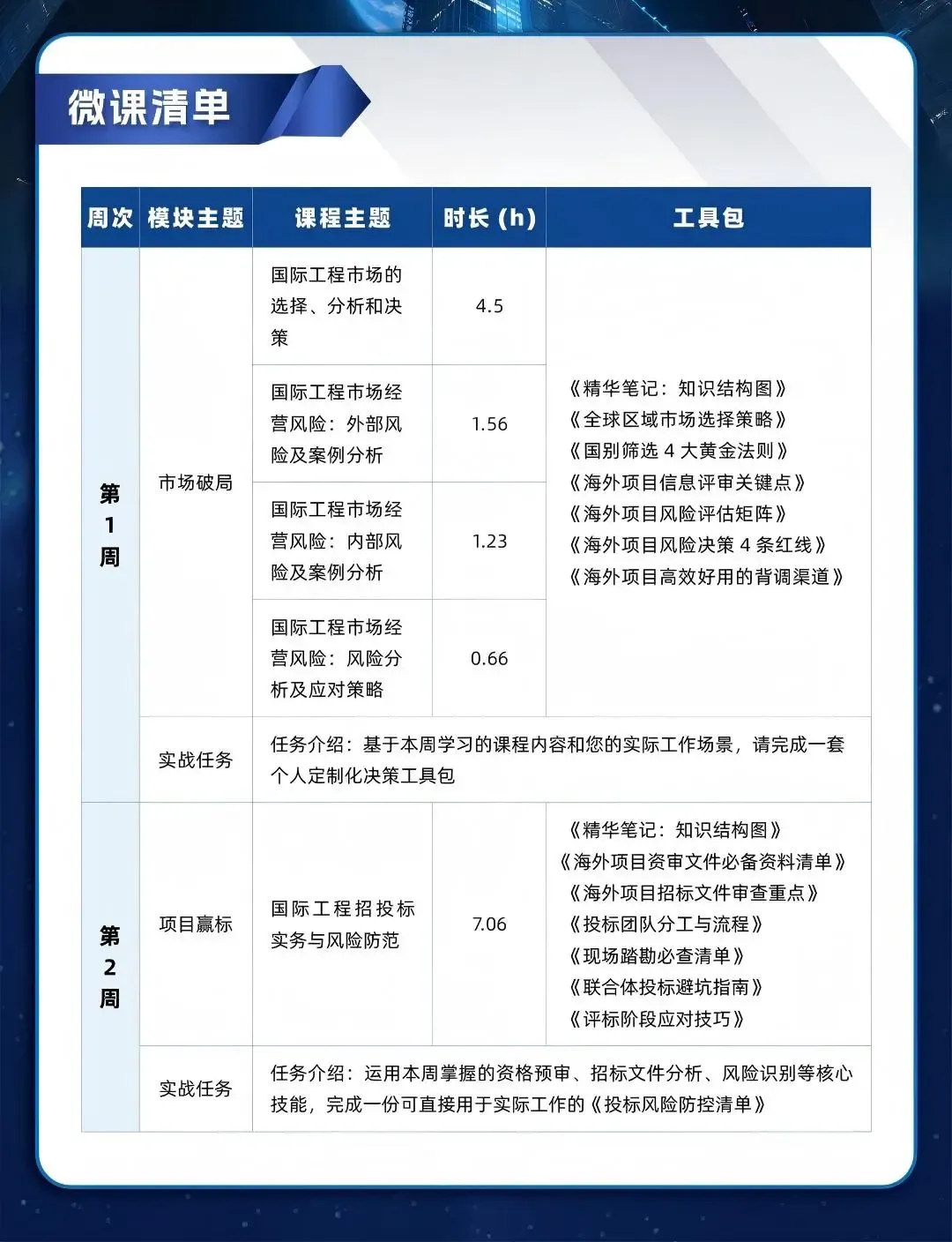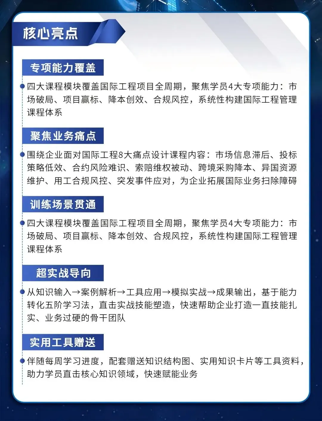 针对企业出海的核心痛点,“破界·出海:国际工程实战能力跃升训练营”应势而生。训练营精准聚焦国际工程四大核心模块,从市场战略选择到全流程风险管控,从招投标实战技巧到合同精益管理,构建全链条覆盖的实战学习体系。