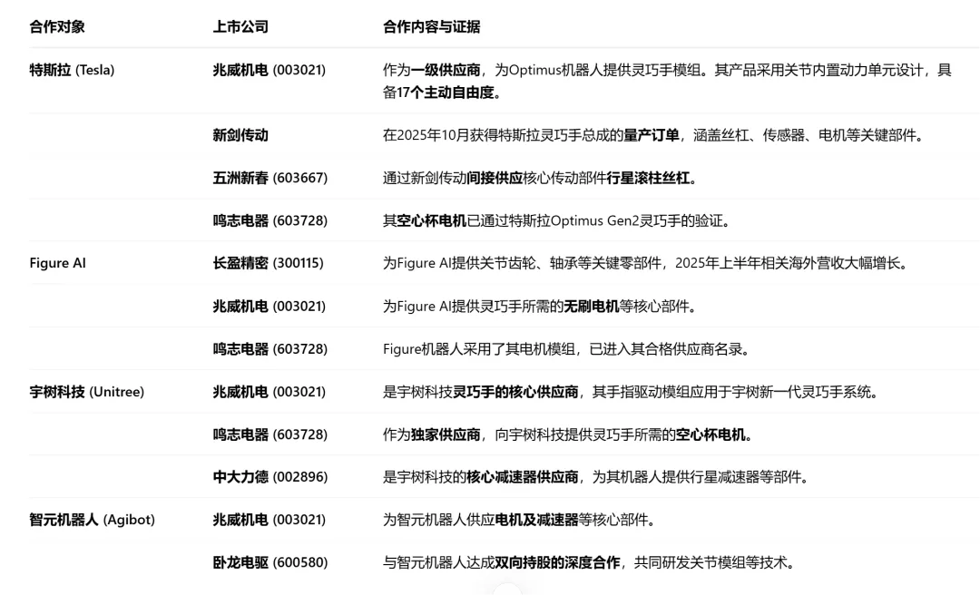 鸣志电器则通过全球并购,掌握了空心杯电机等核心驱动技术,其产品也已进入Figure AI的供应链。绿的谐波作为谐波减速器龙头,其产品也获得了Figure AI的小批量订单。长盈精密更是与Figure AI签署了为期三年的灵巧手关节总成战略协议。