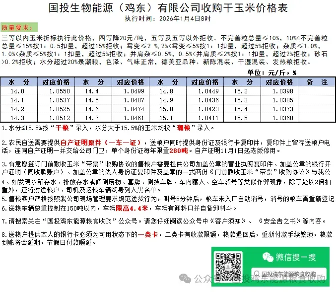 山东米能生物科技有限公司自2026年01月10日起过磅玉米,水份14%-18%(含18%),带票价格执行1.14元,水份18.1%-25%(含25%)价格执行1.12元,25%以上拒收,新陈玉米不得混装,干湿玉米不得混装,其他收购标准不变。