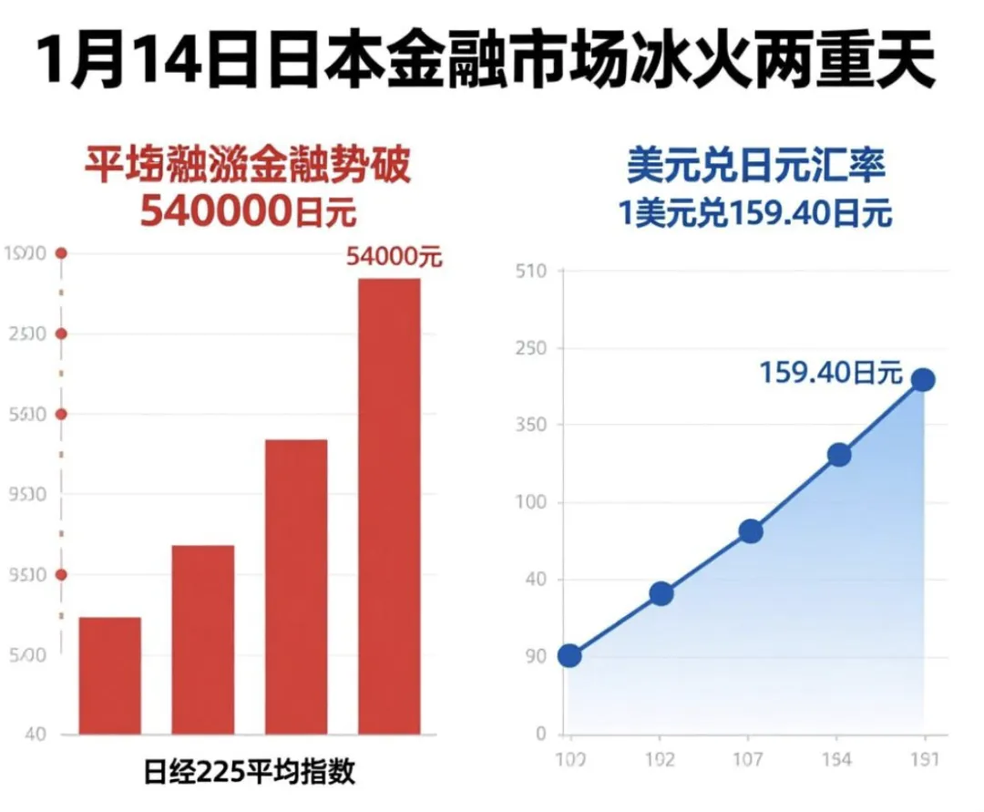 1月14日,日本金融市场上演了一场“冰火两重天”的戏码:东京股市日经平均指数如脱缰野马,首次冲破5万4000日元大关,收盘报5万4341日元,较前一交易日狂飙792日元,创下历史新高;与此同时,日元汇率却像泄了气的皮球,一度跌至1美元兑换159.40日元,创下约1年半来新低。这一奇特现象,被市场戏称为“高市トレード”(高市行情)。