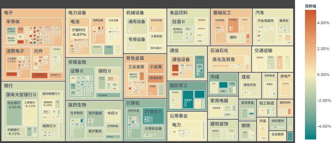 申万一二级行业热力图,体现行业每日涨跌情况。