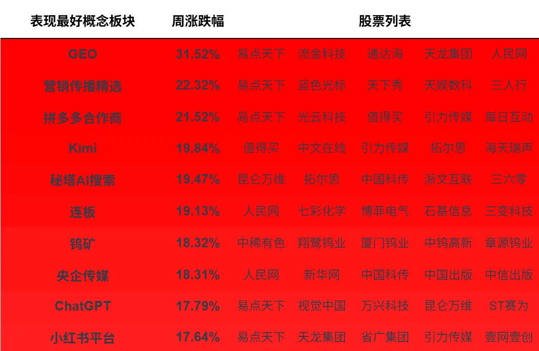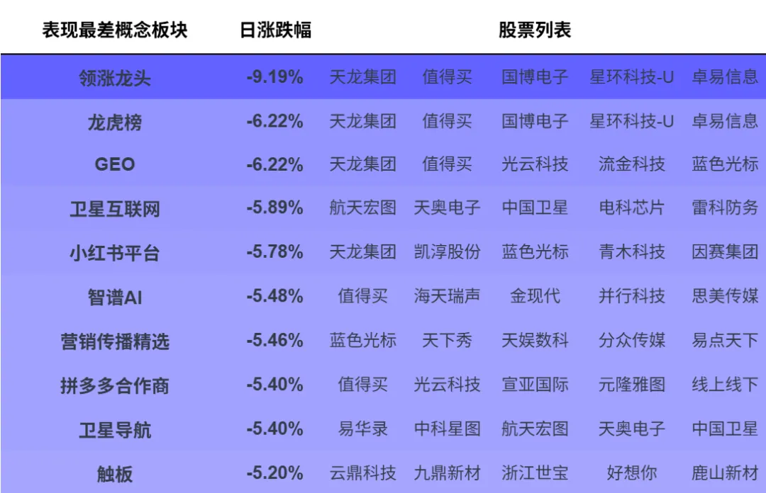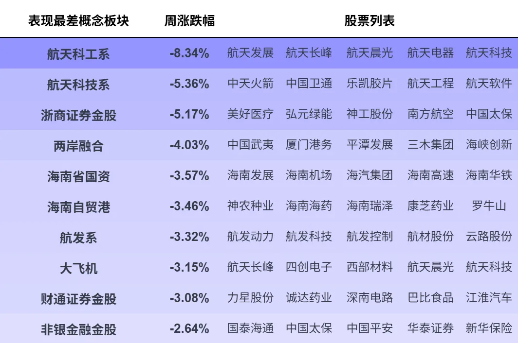 本文选取Wind热门概念板块进行日度和周度(滚动7个自然日)进行跟踪,分别展示表现前10和后10板块的表现情况并展示5个以内的代表标的。