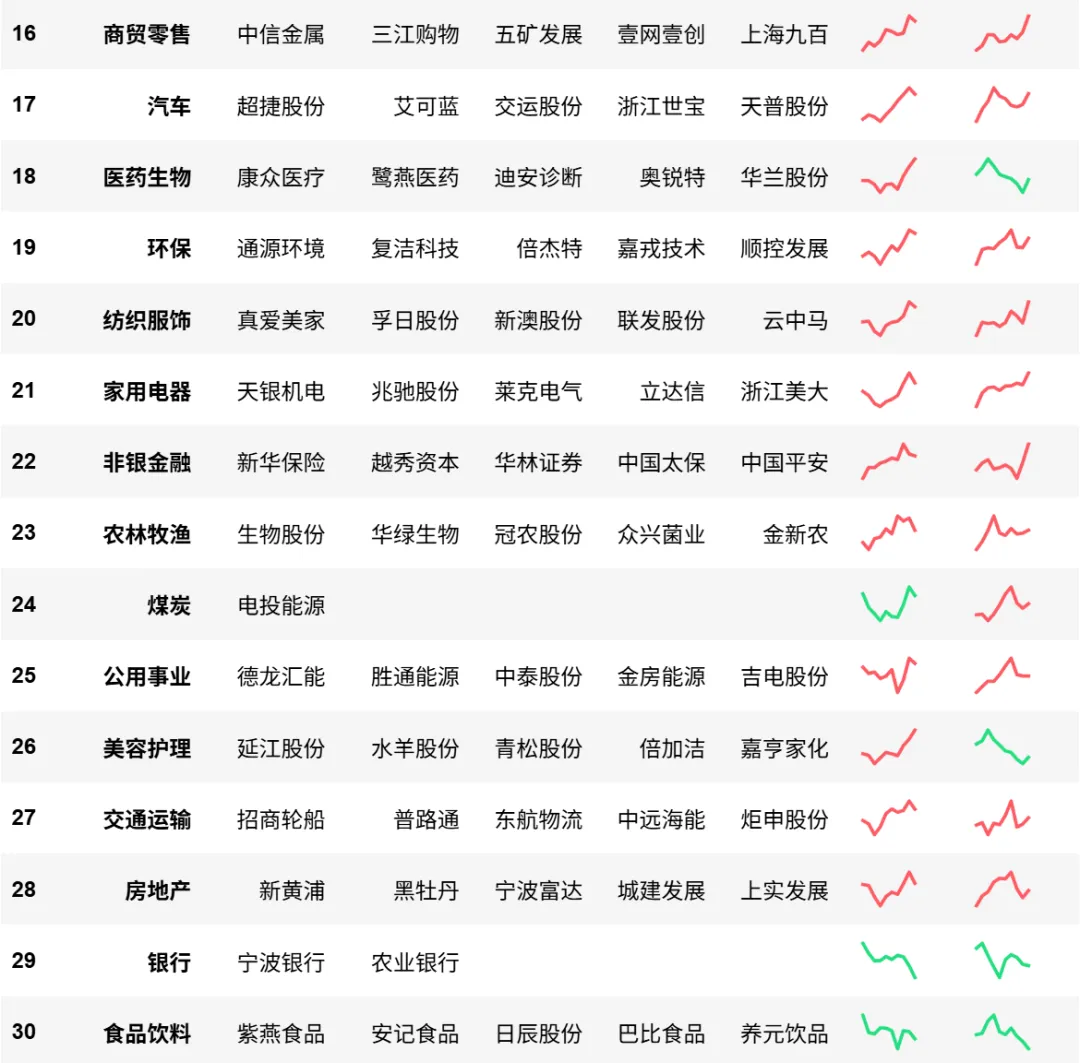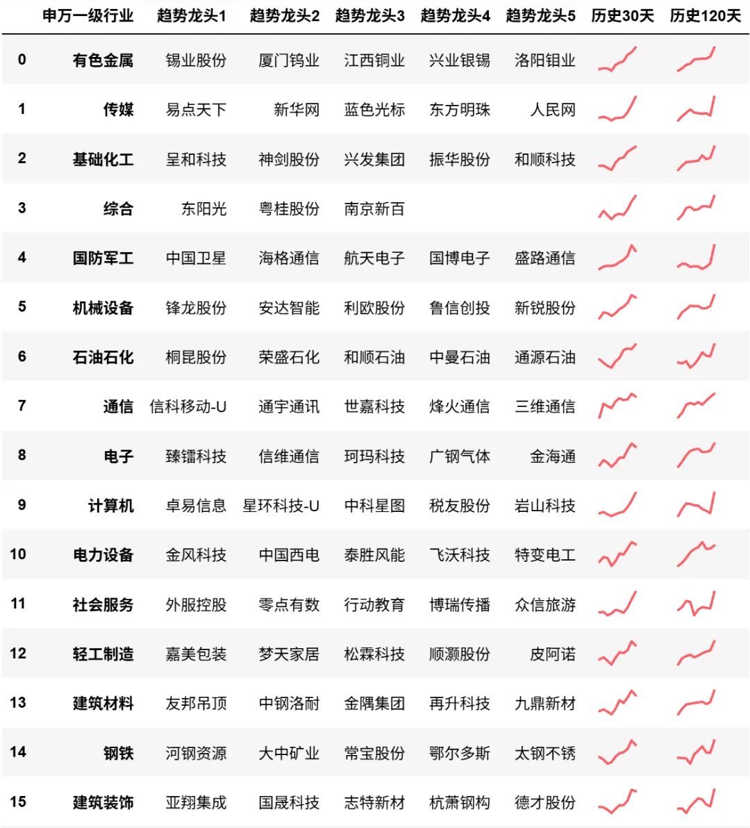 个股由左到右是对每个申万一级行业内部个股动量的排名,并计算趋势龙头前5名,个别行业若前5名动量低于全市场前30%不予显示。