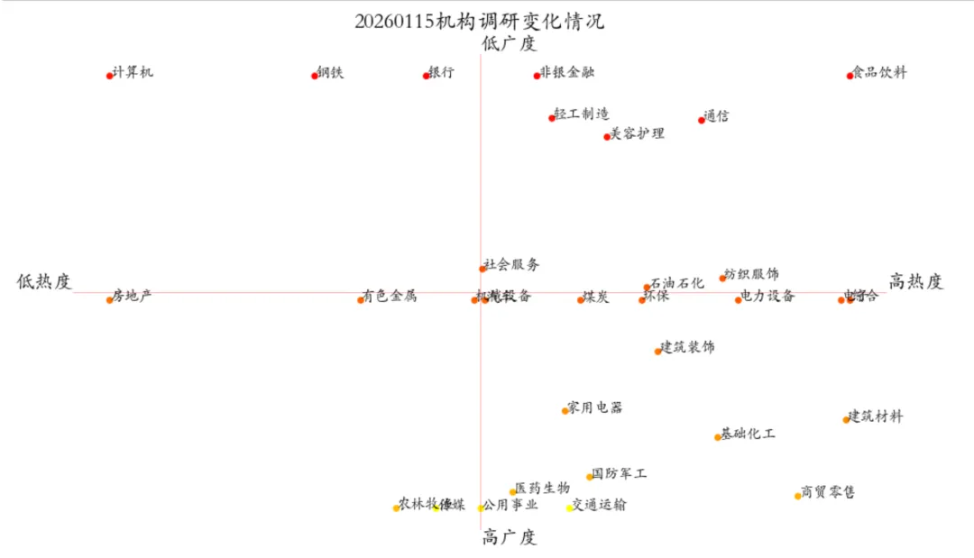 机构调研广度指和过去一段时间相比,相应滚动窗口机构在对应申万行业中的个股覆盖比例增加或减少。