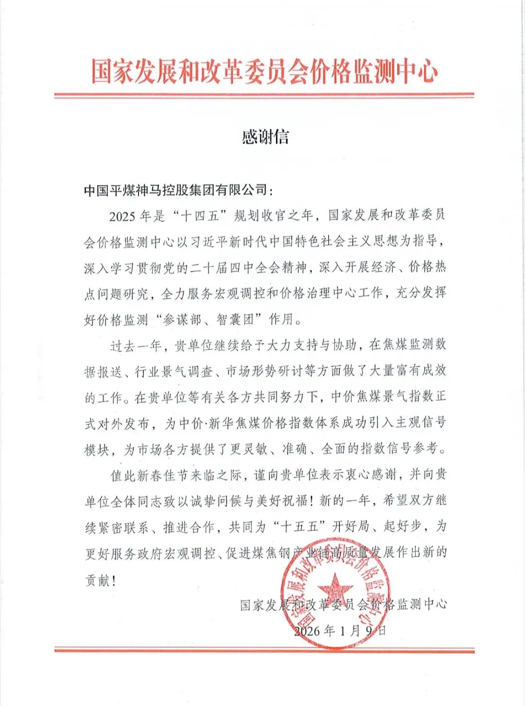 1月9日,国家发展和改革委员会价格监测中心向中国平煤神马集团发来感谢信,对集团2025年给予该中心的大力支持与协助表示感谢,并向全体干部职工致以诚挚问候与美好祝福。