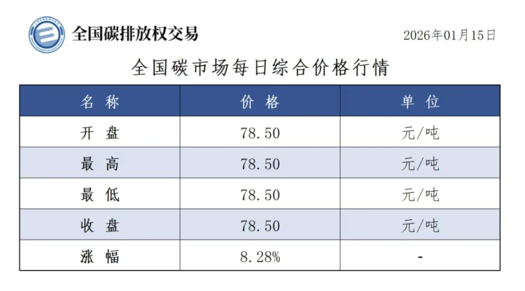 今日全国碳市场综合价格行情为: 开盘价78.50元/吨,最高价78.50元/吨,最低价78.50元/吨,收盘价78.50元/吨,收盘价较前一日上涨8.28%。