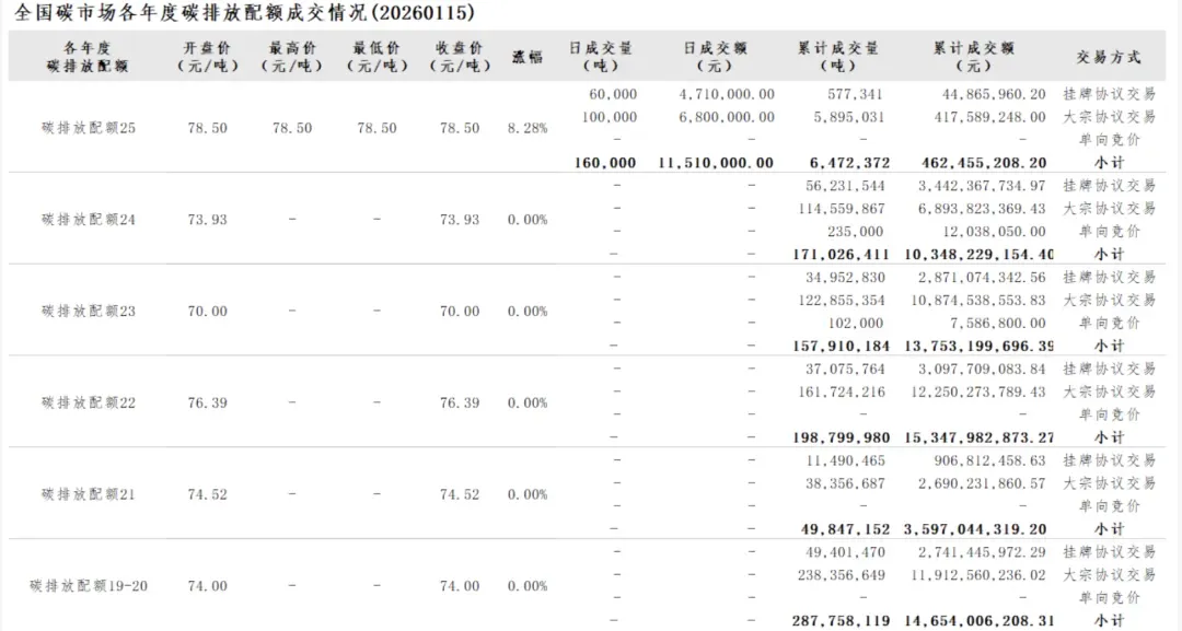 截至2026年1月15日,全国碳市场碳排放配额累计成交量871,814,218吨,累计成交额58,162,917,459.77元。