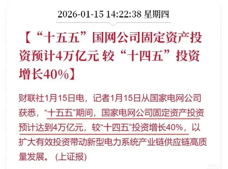 周四(1月15日)A股市场呈现结构性行情,半导体、电力设备板块在政策与行业利好推动下集体走强,AI应用、商业航天等题材亦表现活跃。以下为当日重点板块与资金动向梳理:一、国家电网“十五五”投资计划落地,电力产业链迎发展机遇