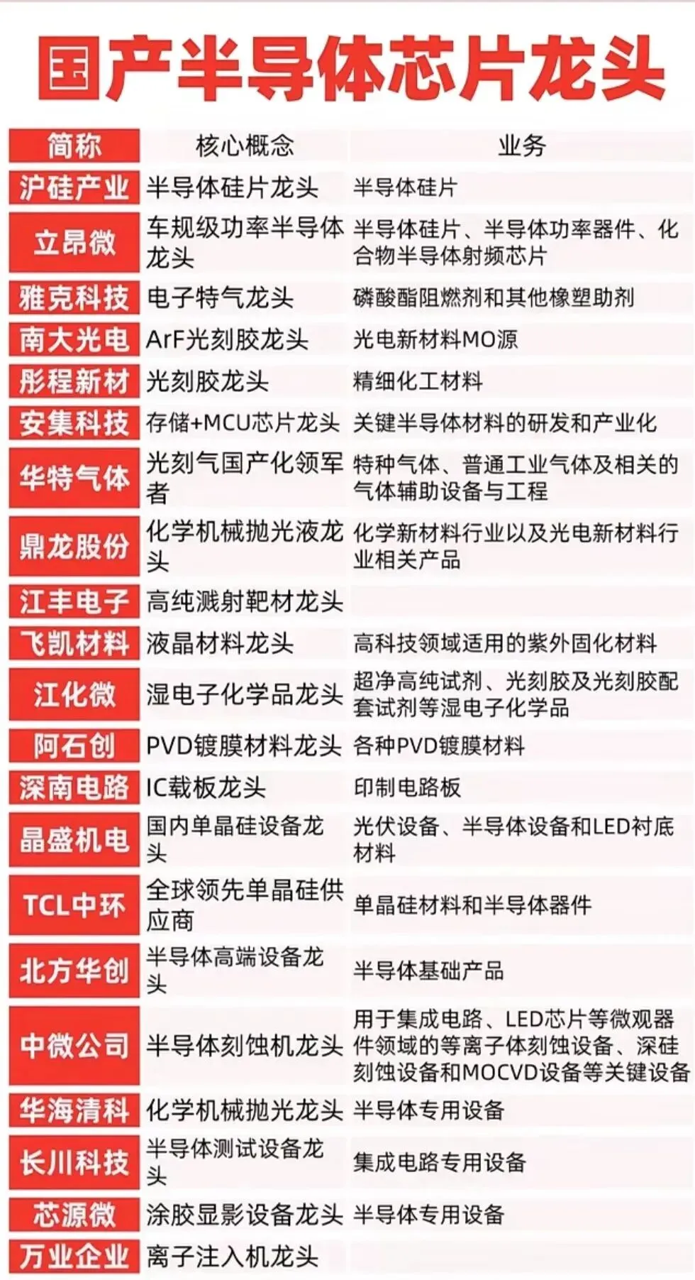 海外方面,美股半导体设备股夜盘大涨,台积电、阿斯麦等领涨;同时美国白宫宣布对特定半导体及设备加征25%关税,进一步凸显国产供应链自主紧迫性。国内半导体设备、材料、设计等环节有望持续受益。三、国产半导体核心龙头名单一览
