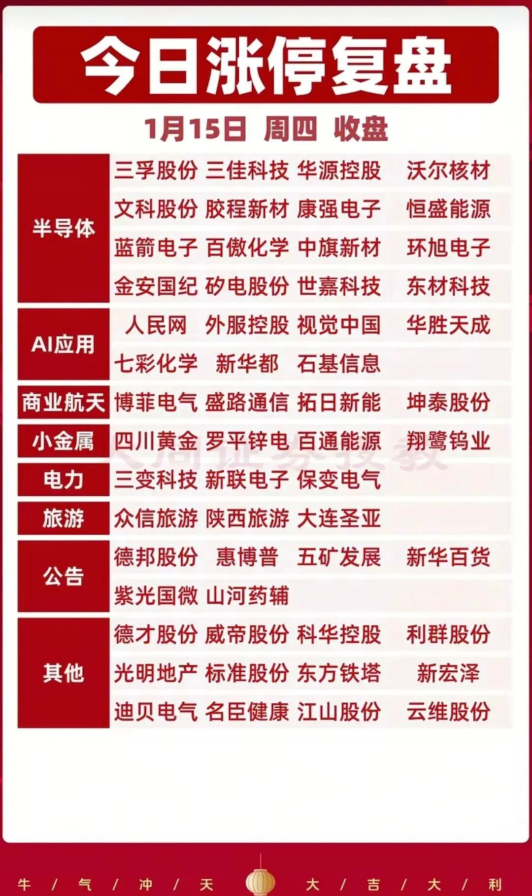 1月15日A股市场呈现结构性行情,芯片半导体、电力设备板块在政策与行业利好推动下集体走强,AI应用满屏-20CM