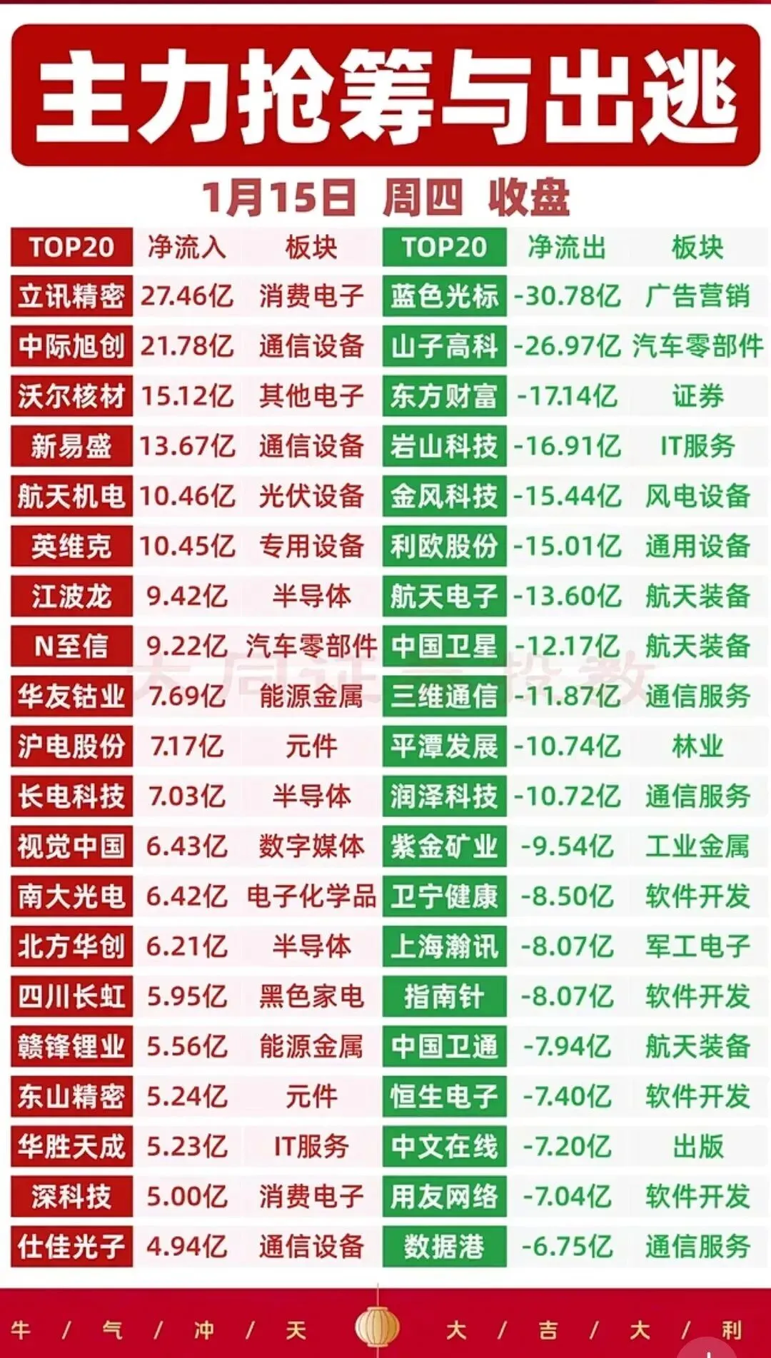 1月15日涨停个股集中分布于半导体、AI应用、商业航天等板块,其中三孚股份、彤程新材、蓝箭电子等多只半导体概念股涨停,市场赚钱效应聚焦科技赛道。五、主力资金动向:硬科技获大额流入,立讯精密、中际旭创受青睐