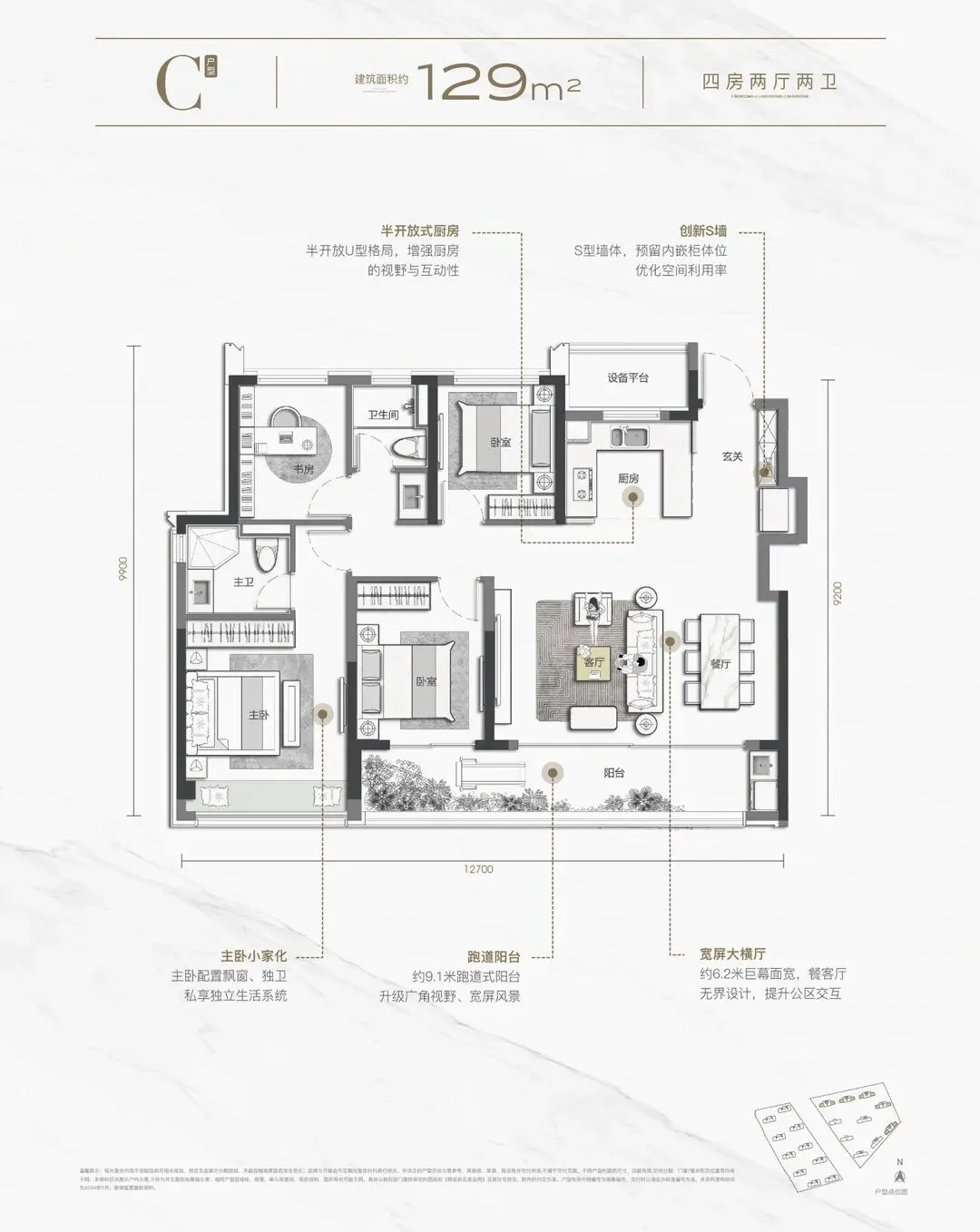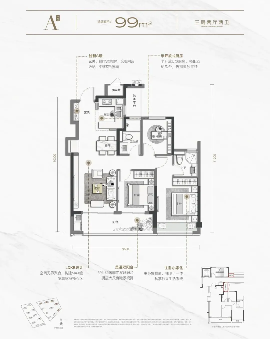 比如建面约143㎡也做到了四房+全明三卫(一般同户型仅两卫)。半开放厨房是全系标配,约98㎡的入门户型也不例外。多数户型都采用“S墙”设计,可以将冰箱外置,将空间利用到像素级。