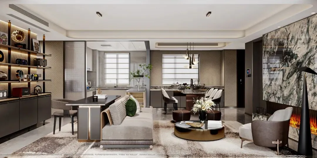 成本昂贵的半开放厨房,推开移门就能秒变岛台,和餐客厅组成一个超大方厅。一场十几人的大派对,都能轻松hold住。