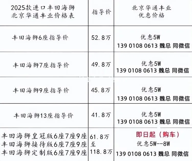 丰田海狮6座‹丰田海狮4s店热线:139 0108 0613 魏总-同微信›奢华版:高端商务出行的极致之选在高端商务出行的广阔领域中,真正意义上的奢华并非体现在那些浮夸招摇的外表之上。相反,它是在每一处细节里所自然流露出来的尊贵体验,以及能够带给人们的极致舒适享受。