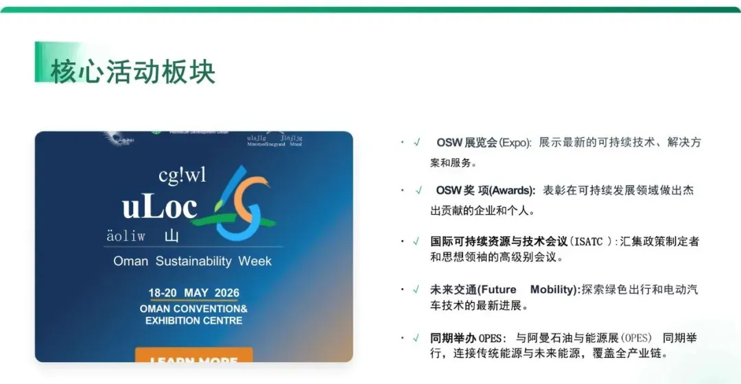 在全球能源格局加速变革的时代浪潮中,阿曼能源产业以蓬勃之势迅猛发展,众多关键项目成果斐然,成为行业瞩目的焦点。即将于 2026年5月18-20日在阿曼马斯喀特国际会展中心举办的 2026 阿曼可持续能源周,将汇聚全球能源行业精英,共同探索能源发展新路径,为全球能源领域的交流合作搭建起一座宏伟桥梁。