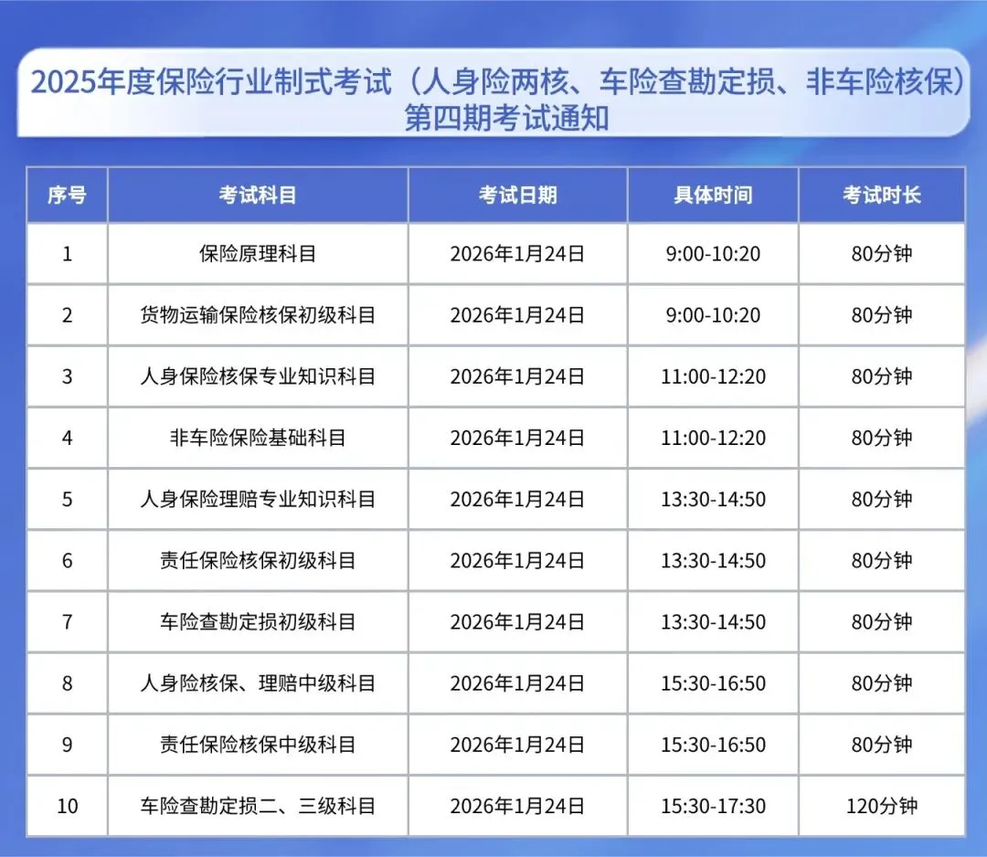 人身险两核、车险查勘定损及非车险核保等十科制式考试将于2026年1月24日(周六)举办,请考生根据以下内容做好考前准备: