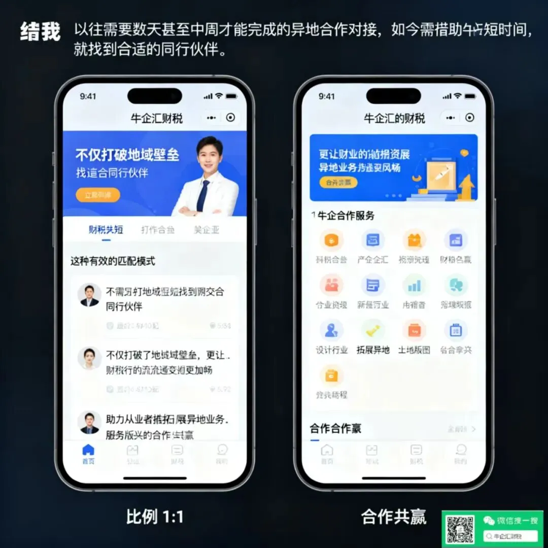 异地协作打破空间边界,构建全域服务网络。跨区域业务拓展与异地资源协同是财税行业的长期痛点,政策差异、信息壁垒导致异地合作风险高、效率低。牛企汇借助小程序轻量化、跨平台特性,打破时间与空间限制,用户无需下载安装,随时随地即可发起异地协作。平台内置全国财税政策规则库与合规校验机制,自动核验合作方资质与业务合规性,有效降低跨区域合作风险,如同成渝税务协同模式般实现“异地办税无差别” 。无论是一线城市机构对接三四线城市代账业务,还是异地涉税鉴证项目协作,都能通过平台无缝衔接。这种无边界协作模式拓展了服务半径,促进了全国财税资源优化配置,让资深团队得以突破地域限制实现规模化发展。